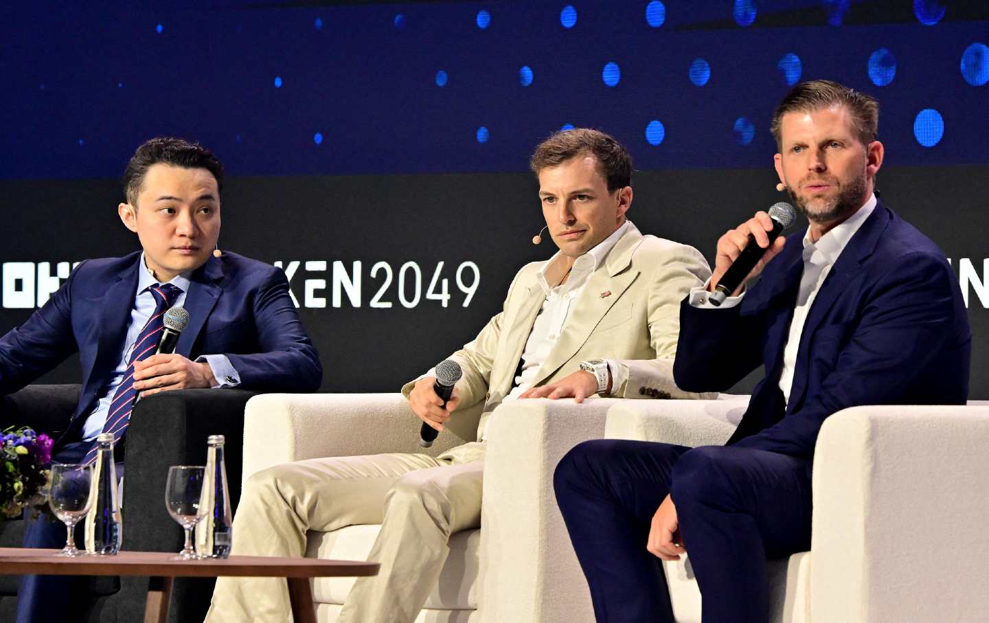 Justin Sun, head of the Tron crypto exchange (L) talks with World Liberty Financial cofounder Zach Witkoff (C) and Eric Trump of the Trump Organization at a May crypto conference in Dubai