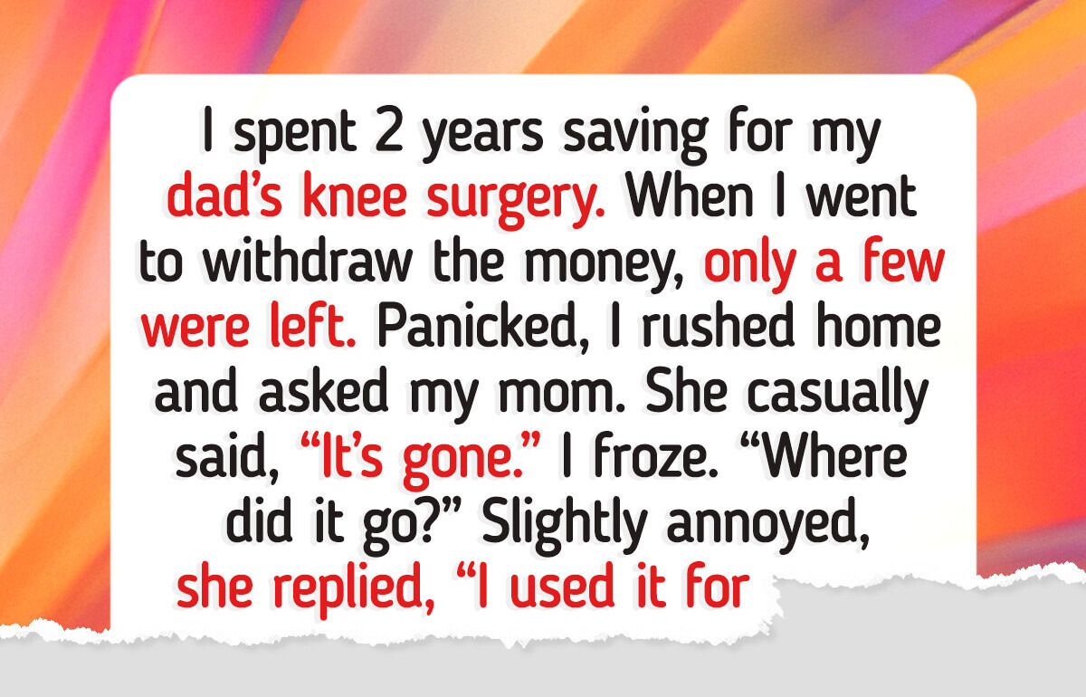 I spent 2 years saving for my dad’s knee surgery. When I went to withdraw the money, only $150 was left. Panicked, I rushed home and asked my mom. She casually said, “It’s gone.” I froze. “Where did it go?” Slightly annoyed, she replied, “I used it to pay off my debts.”