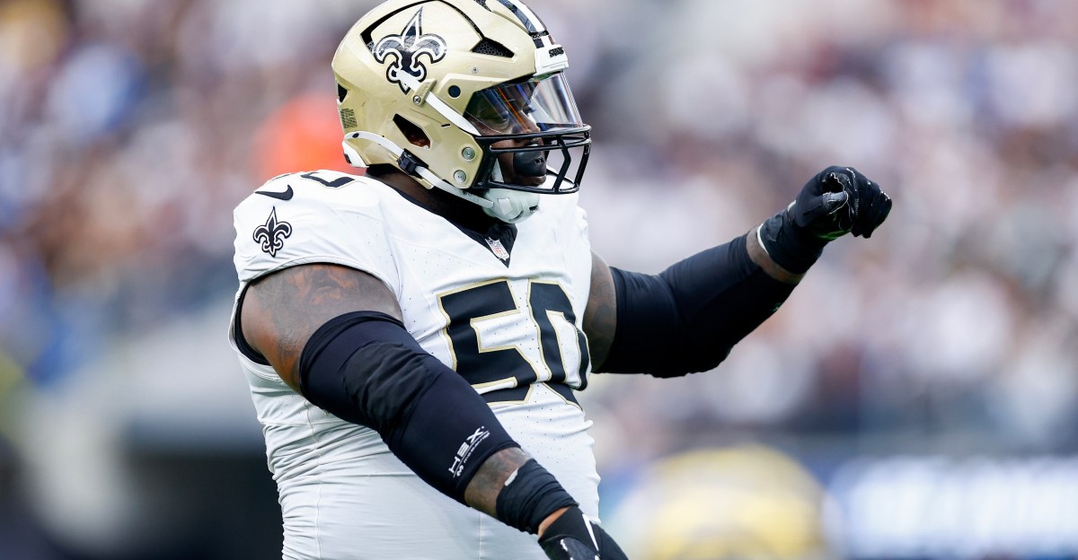 NEW ORLEANS, LA - DECEMBER 01: Khalen Saunders #50 of the New Orleans Saints runs across the field during an NFL football game against the Los Angeles Rams at Caesars Superdome on December 1, 2024 in New Orleans, Louisiana. (Photo by Cooper Neill/Getty Images)