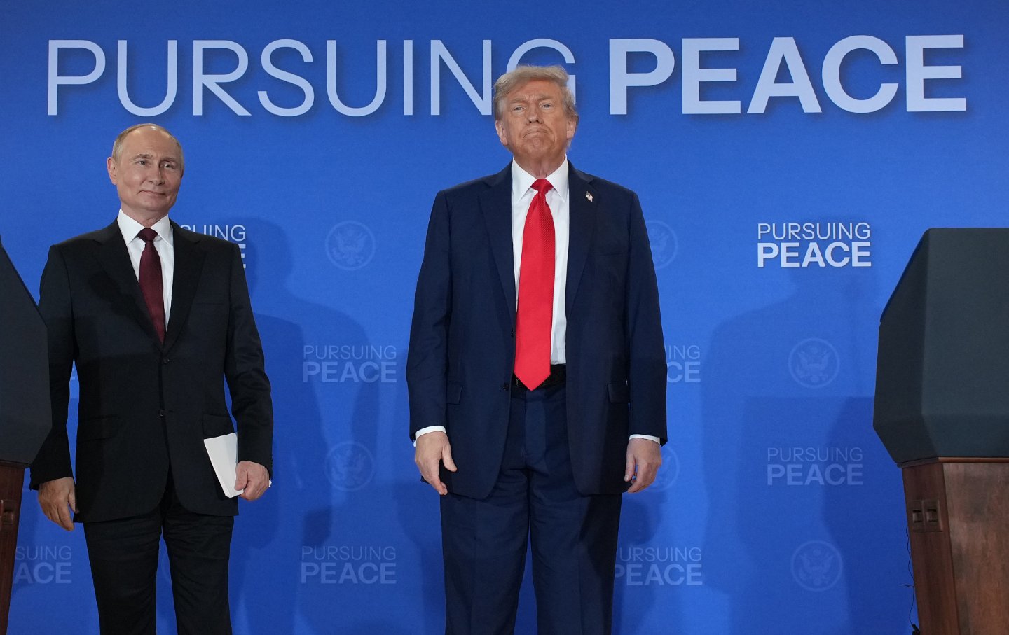 US President Donald Trump and Russian President Vladimir Putin leave at the conclusion of a press conference at Joint Base Elmendorf-Richardson on August 15, 2025, in Anchorage, Alaska.